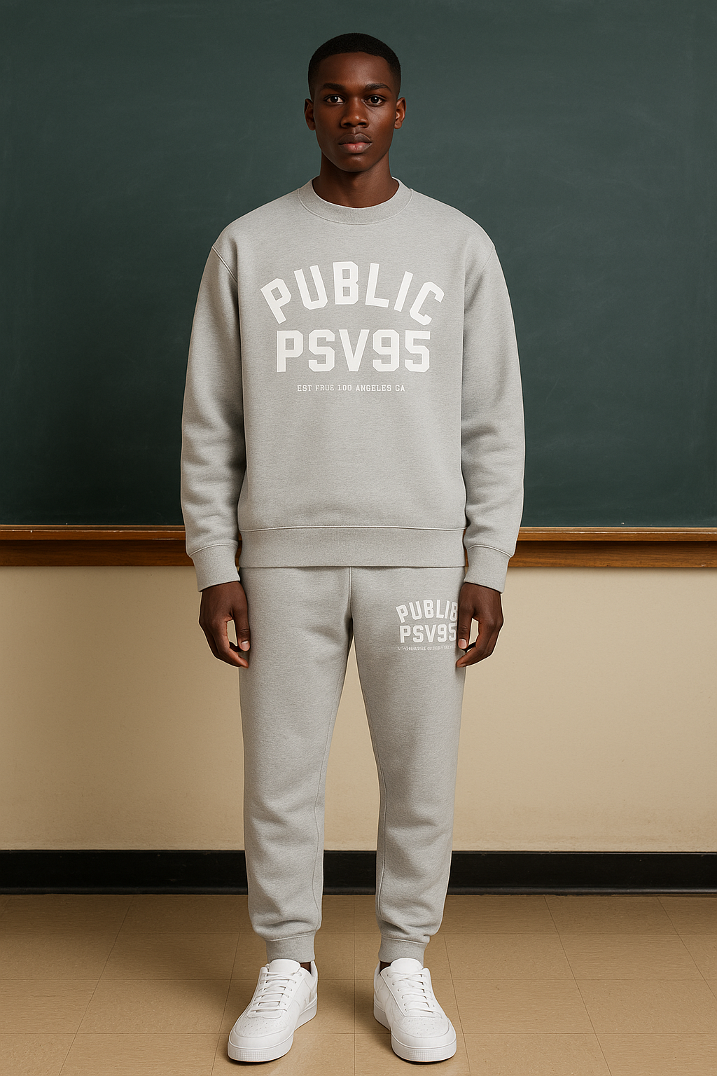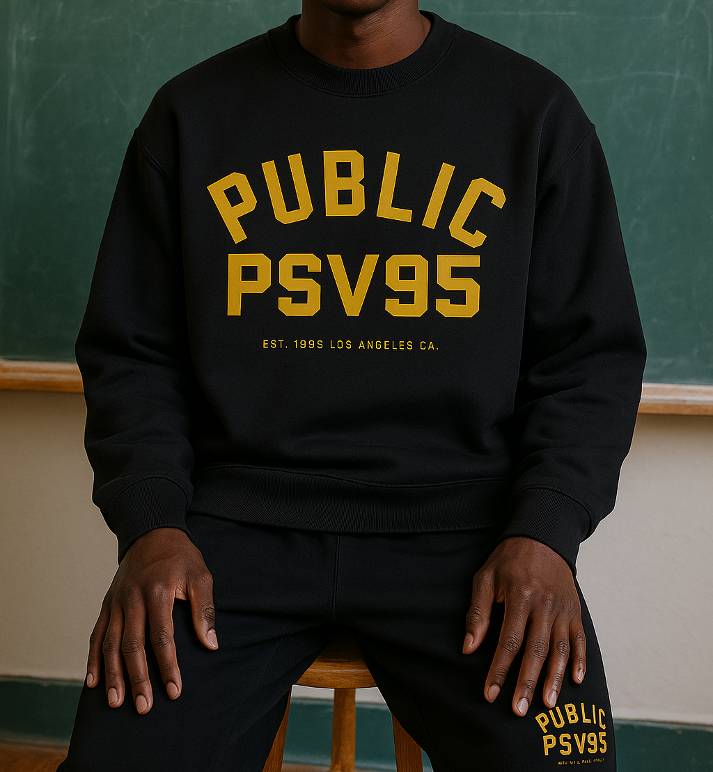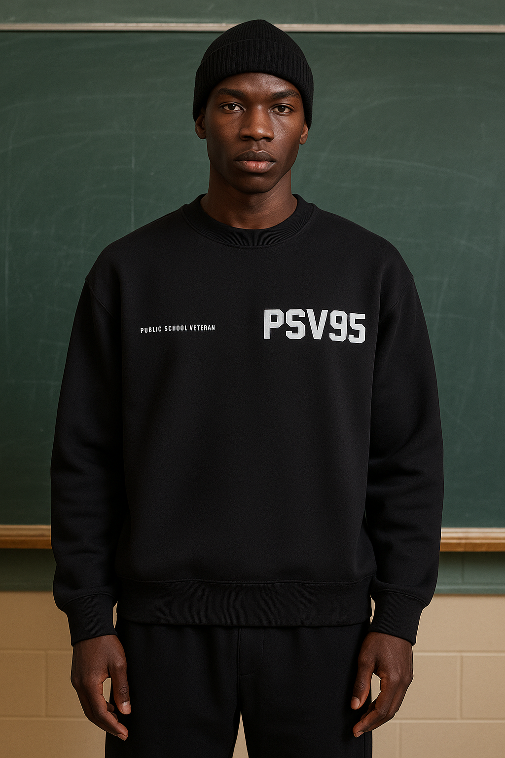 The PUBLIC SCHOOL VETERAN PSV95 Crewneck is a core staple built for comfort and style. Crafted with a tightly knit construction and finished with 2-needle cover stitching at the collar, cuffs, and waistband, this unisex sweatshirt delivers durability with a clean, elevated look. Featuring an ultra-soft hand feel, side-seamed design, and twill neck tape for added structure, it blends everyday wearability with luxury streetwear quality. The front detail print defines the PSV95 abbreviation—marking it as a signature piece from the Public School Veteran collection.