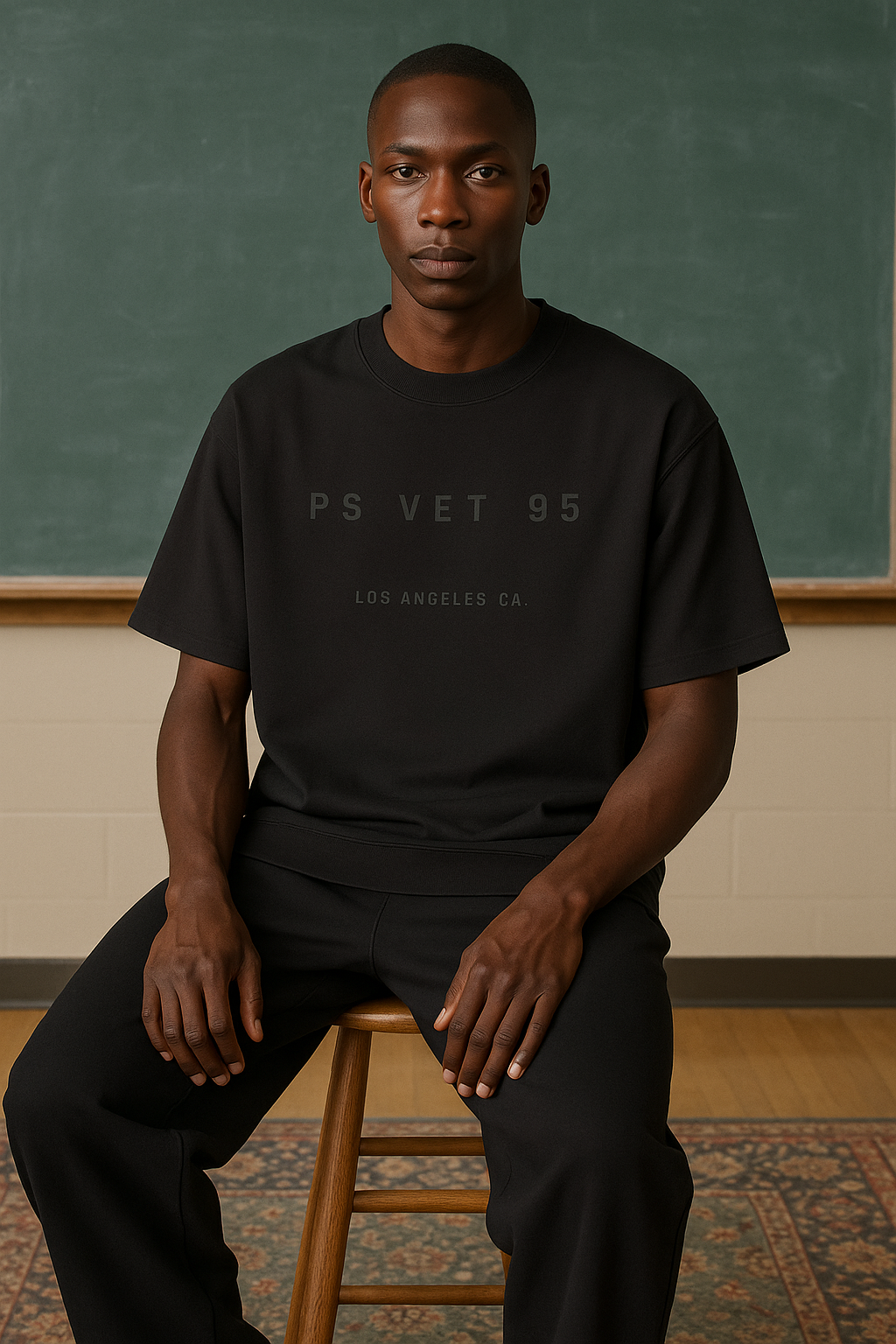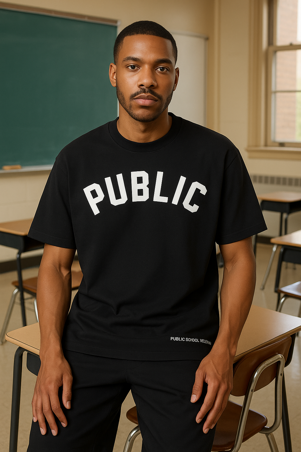 The PUBLIC SCHOOL VETERAN Marquee Collection Tee is a modern essential crafted from heavyweight cotton for a premium streetwear edge. This unisex black T-shirt features a bold front detail print that defines the collection and a signature logo name placed above the bottom hem for a subtle yet elevated finish. Built for durability and comfort, it includes a tightly knit structure, side-seamed design, and reinforced stitching—making it a core piece that blends everyday wear with luxury aesthetics.