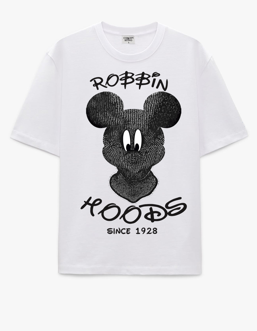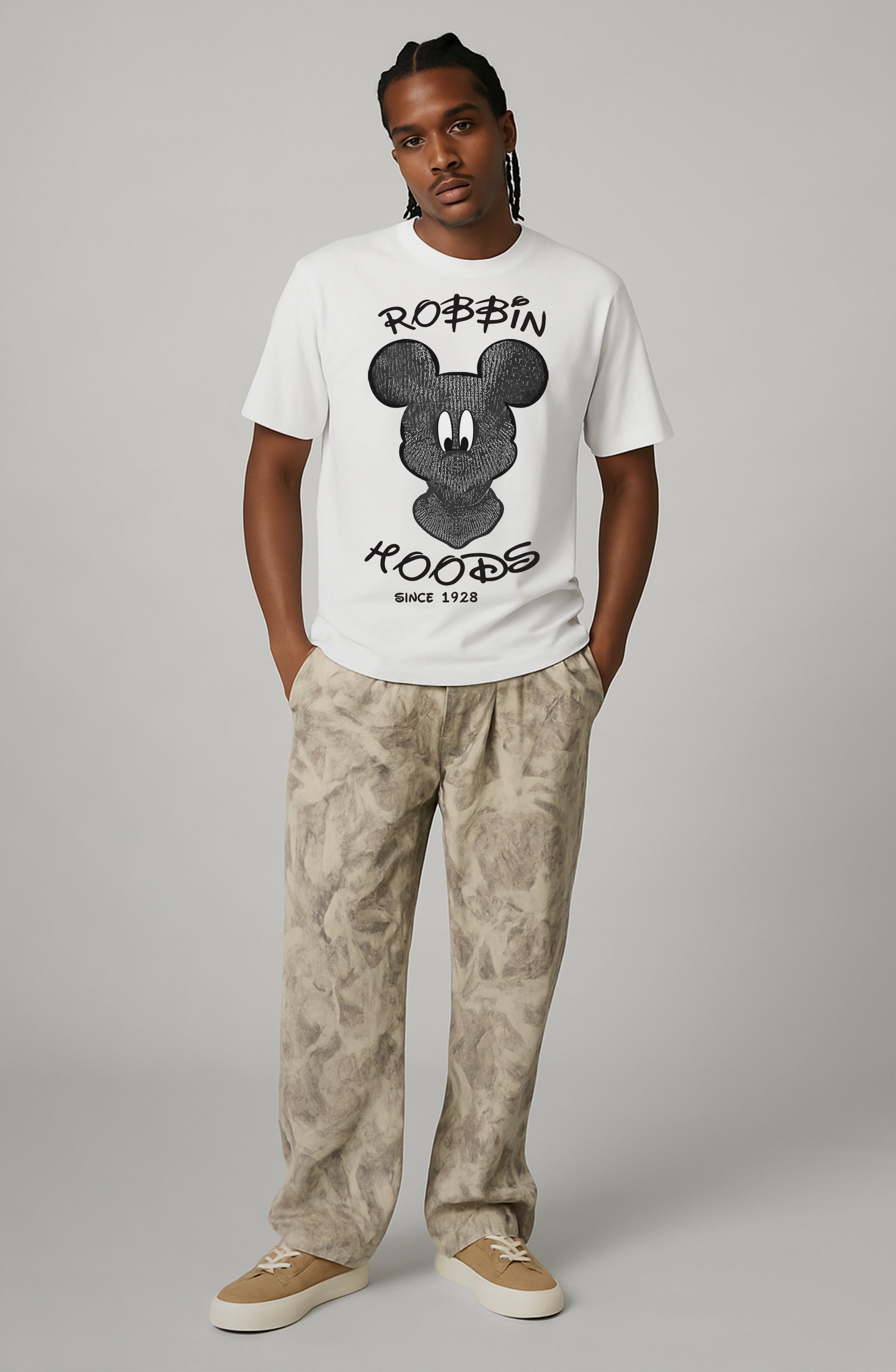 Robbin Hood Limited Edition T-Shirt. Short sleeve cotton jersey t-shirt . Rib knit crew neck collar. Graphic printed on front and back. Color: White 100% cotton. Imported.