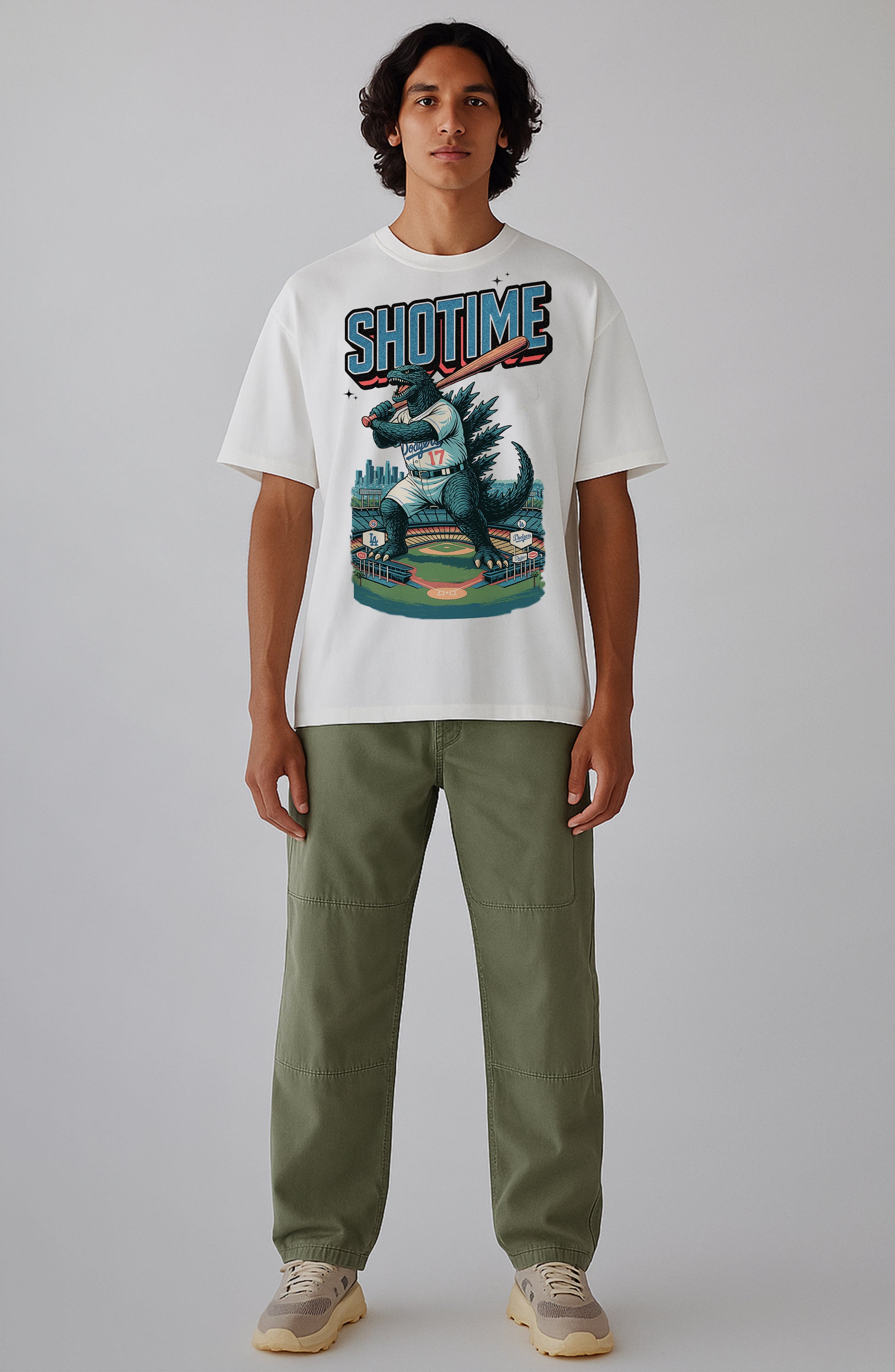 Front and center, a bold Showtime Godzilla tribute graphic brings larger-than-life energy to the piece, merging pop culture with hoops-inspired streetwear attitude. The combination of heavyweight fabric and striking artwork makes this tee as durable as it is iconic.